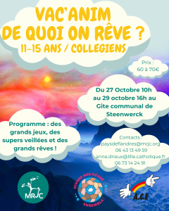 Le MRJC (Mouvement Rural de Jeunesse Chrétienne) et l’ACE (Action Catholique des Enfants) organisent un vac’anim collégiens (11-15 ans) du 27 au 29 octobre à Steenwerck (59) !